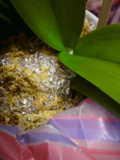 先日、お店をオープンした際に頂いた胡蝶蘭の鉢植えの根元に、水晶チップを、撒いています。