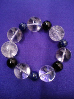 今、私が身につけているブレスは、16ミリの水晶とクラック水晶、12ミリのアメジスト、10ミリのラピスラズリで組み合わせて作ったモノです。