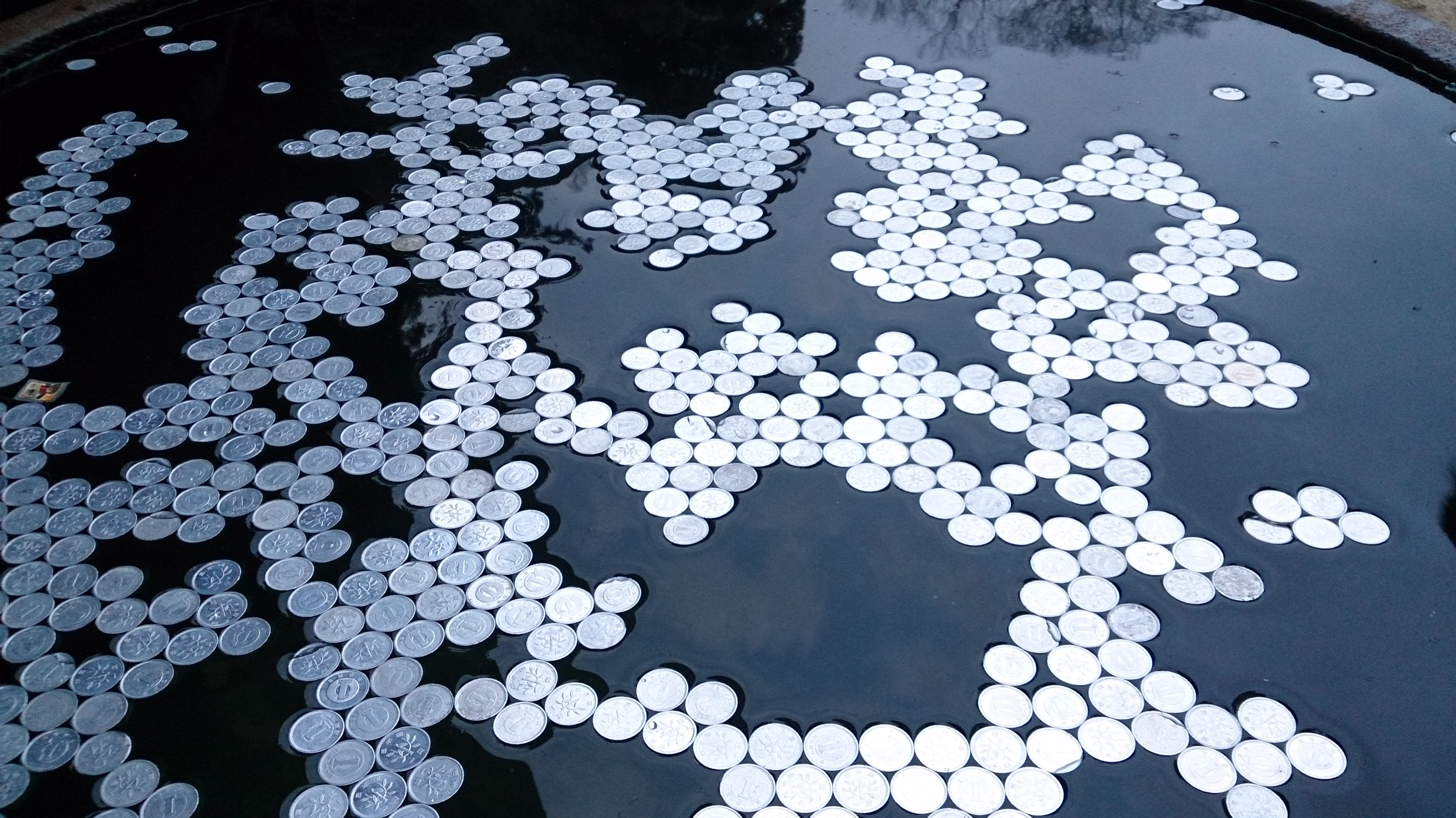 そして、本宮にお参りを済ませて下ってきたところにあった旭社にも行きました。ここは、1円玉を浮かべて、1円玉が沈まなかったら、願い事が叶うという事だったので、早速挑戦してみると…浮かびました!
