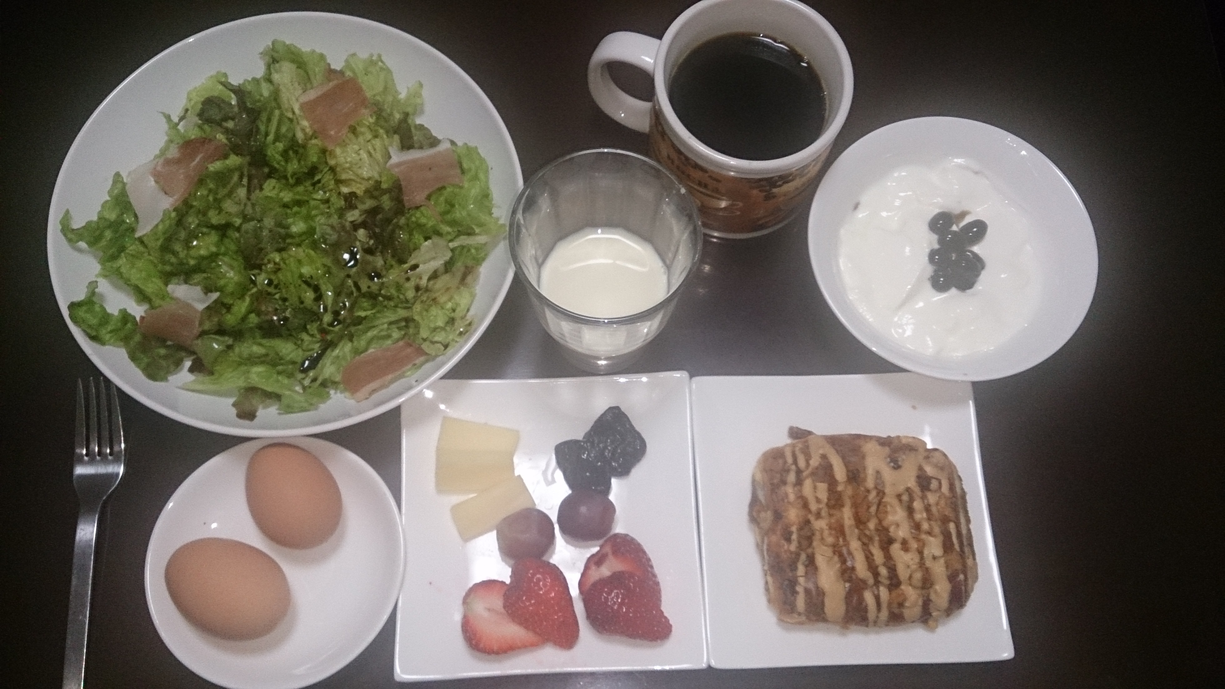 今日は、くるみと中に甘いペーストの入ったパン、スカモルツァ(チーズ)、イチゴ、レッドグローブ、プルーン、プロシュートクルドとサニーレタスのサラダ、ゆで卵、豆乳、黒豆をトッピングしたカスピ海ヨーグルト、コーヒーです。
