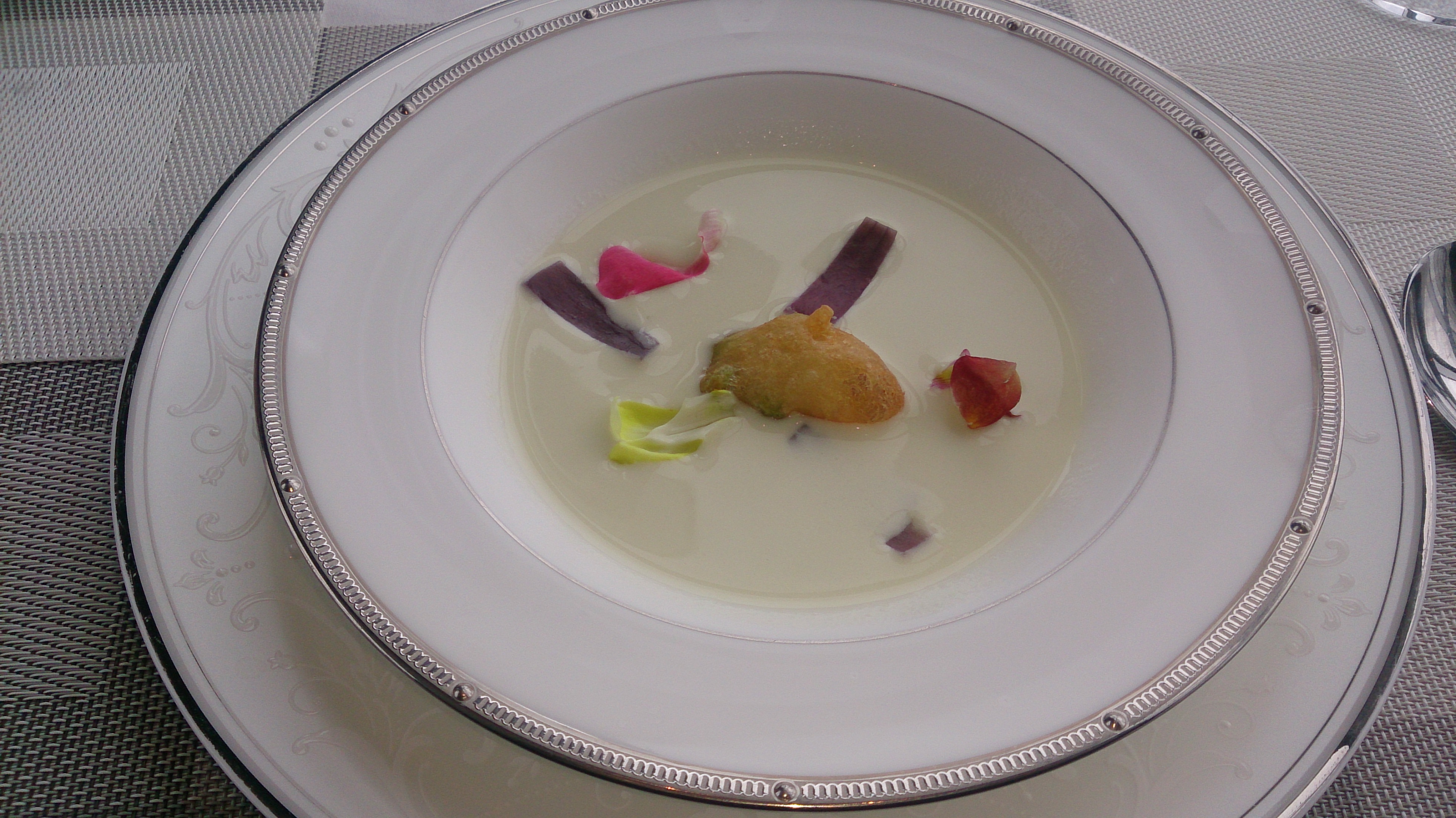 スープのうきみは、枝豆のフリットと紫たまねぎ、お花でした。