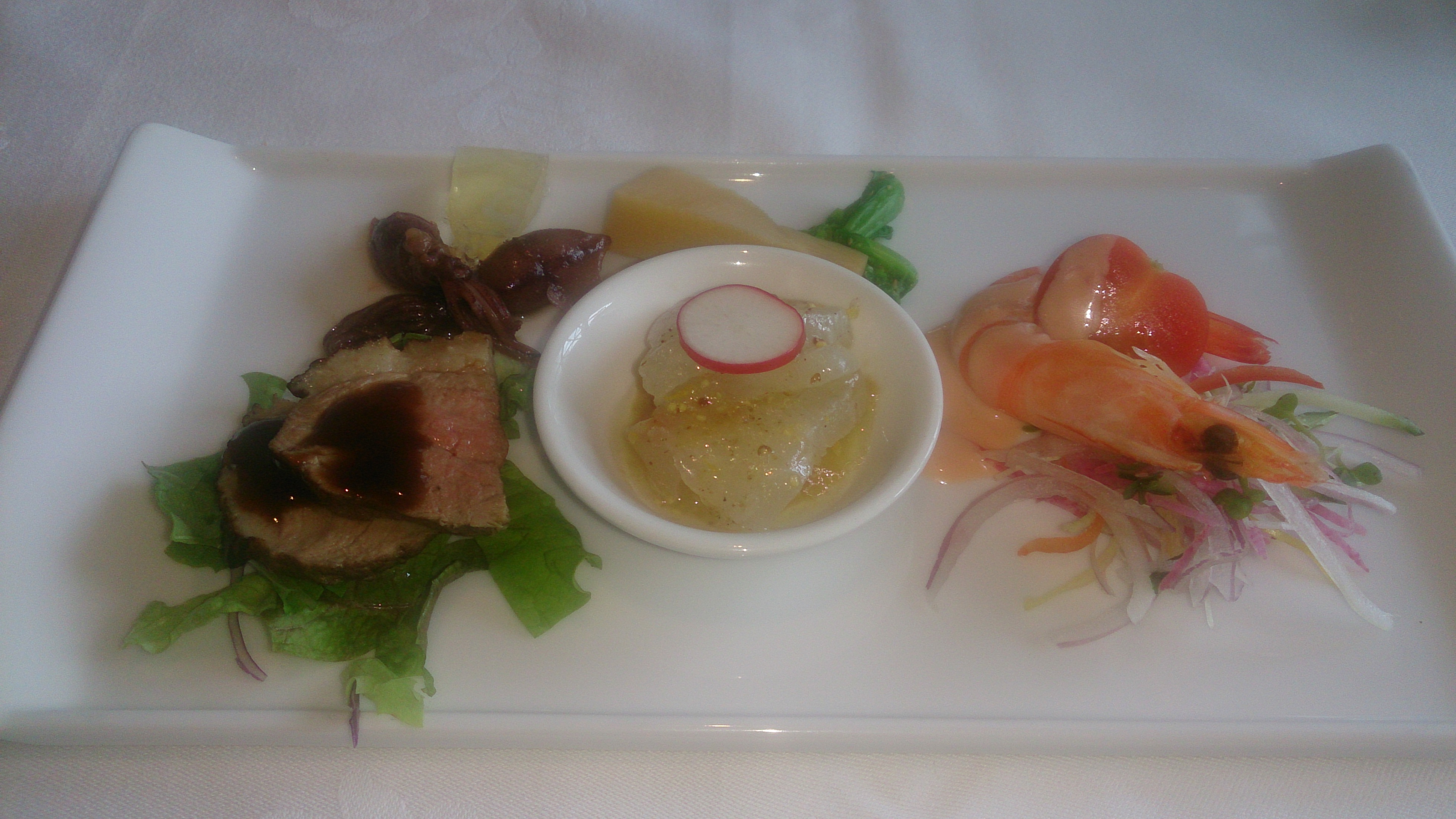 これが、フカヒレコースの前菜なんですが、鯛のカルパッチョ、ローストビーフ、いか、えび、など、4種類が盛り合わせてありました。