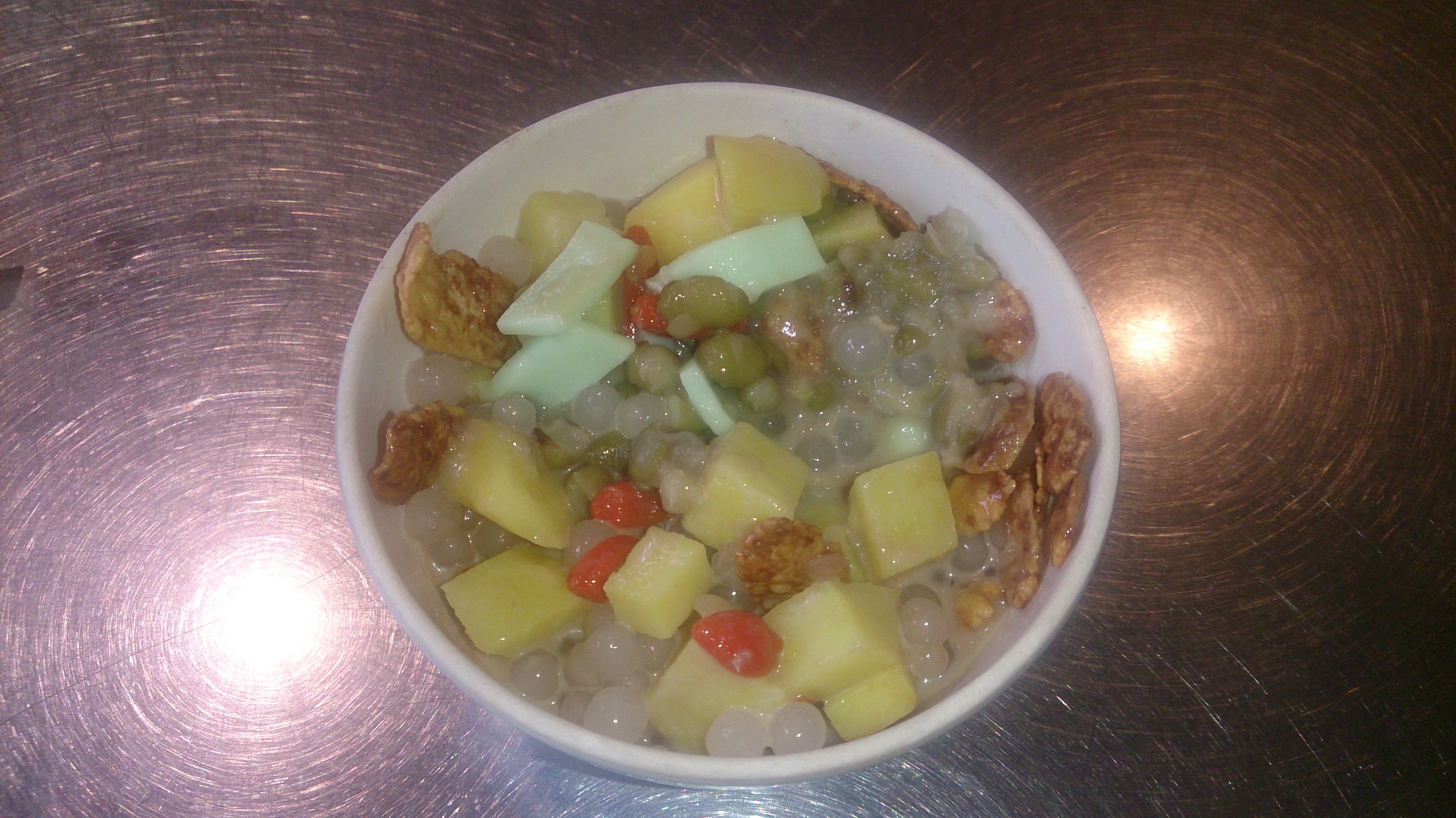 私がデザートで選んだのは、仙草ゼリー、タピオカ、マンゴー、さつまいも、パッションフルーツの寒天、緑豆です。