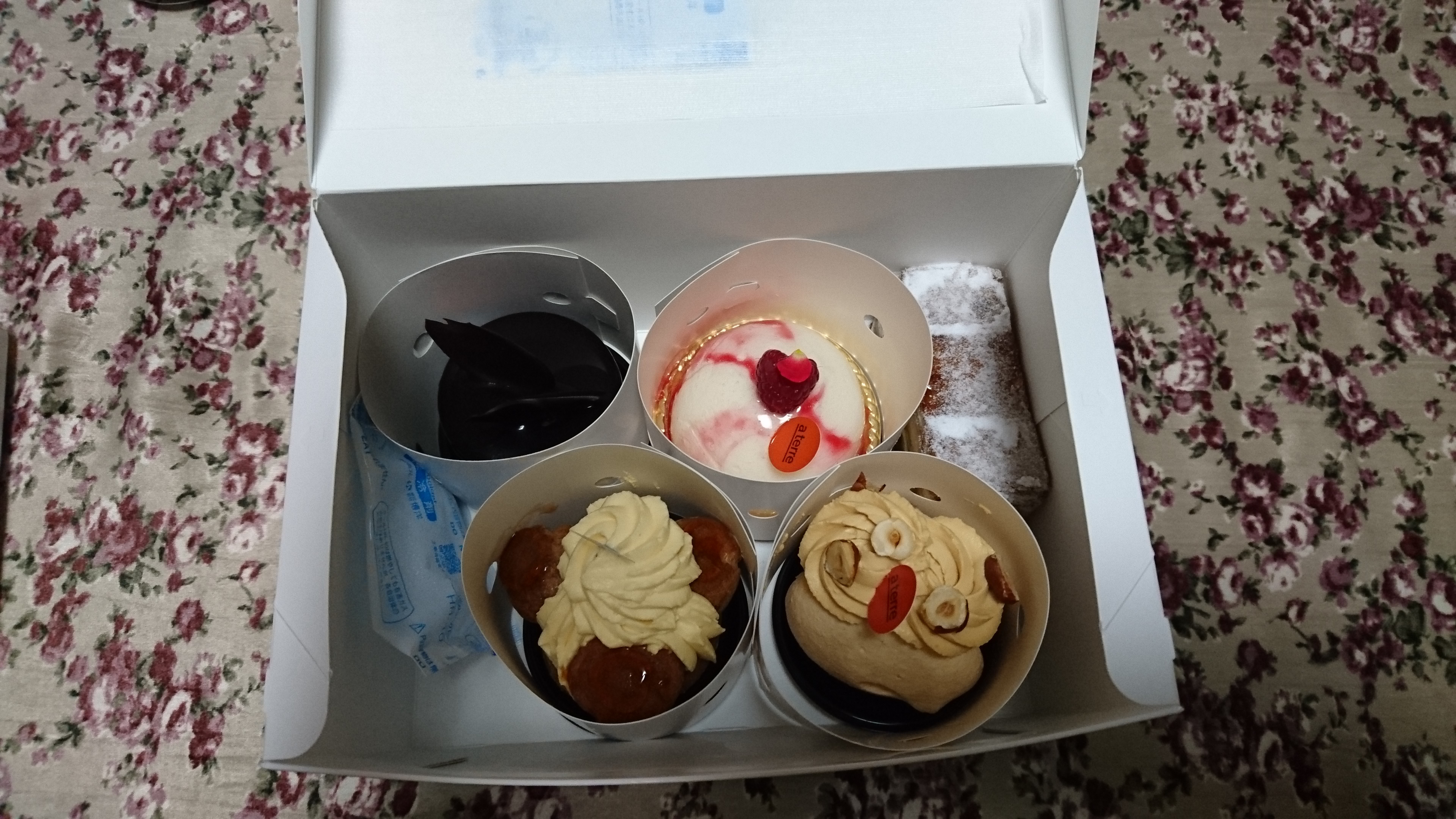 ミルフィーユやチョコレートケーキ、ちっちゃいシュークリームが飾ってあるケーキなど、全部で五種類です。